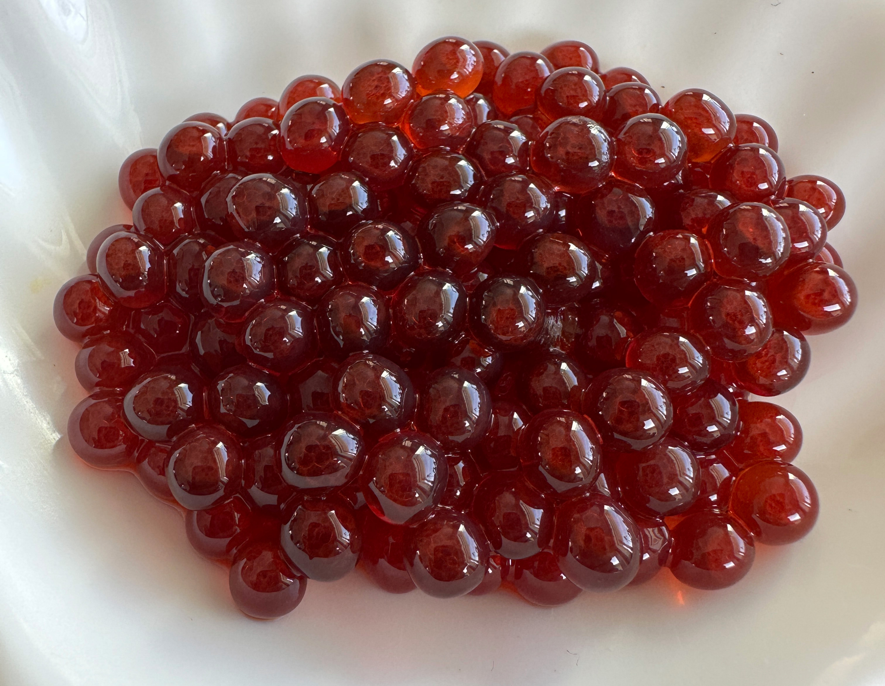 1️⃣ 色泽鲜艳透亮: 红鲑卵呈现出一种明亮的“宝石橙红色”(vivid translucent