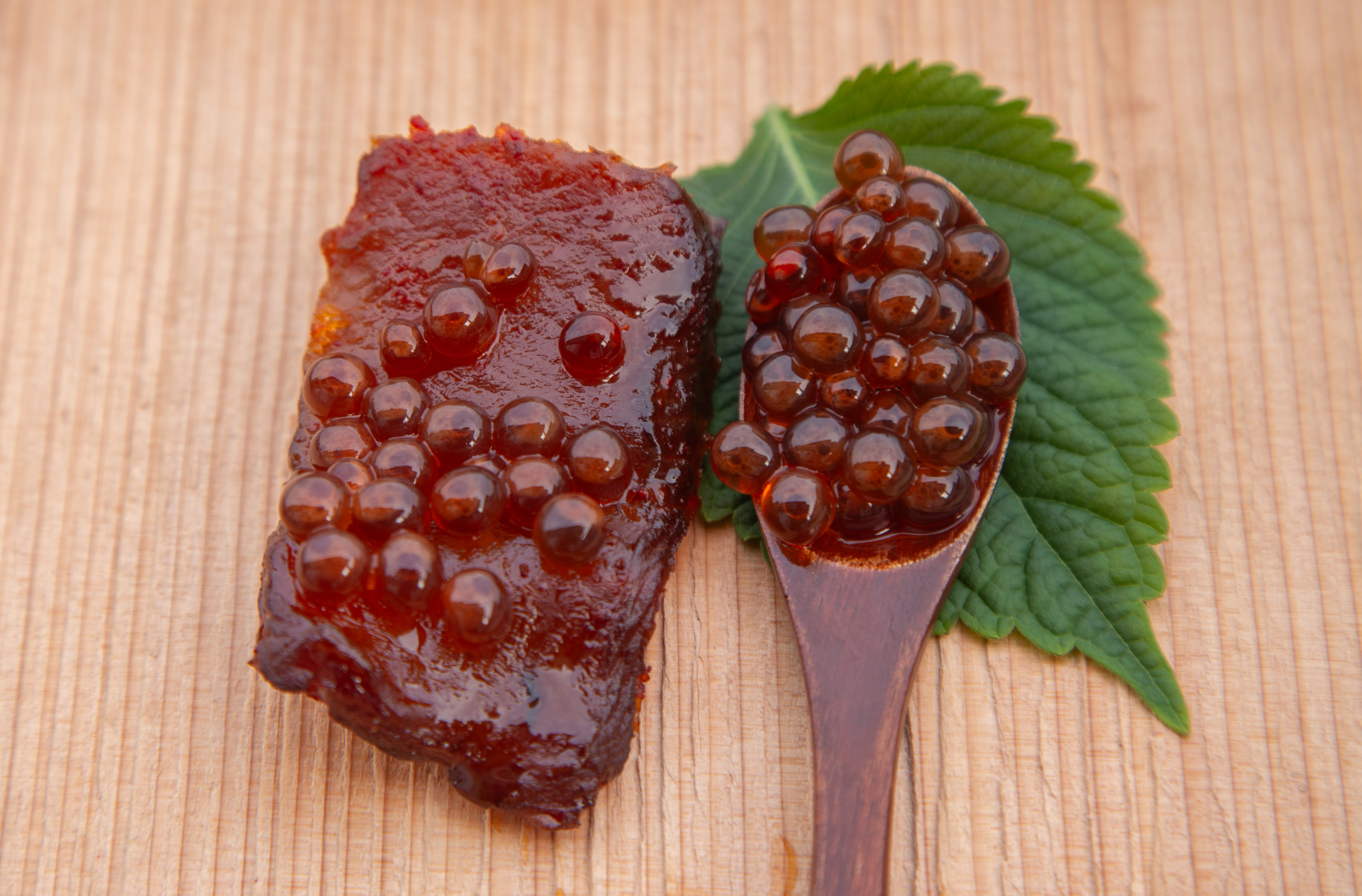 红鲑卵红鲑卵的卵膜最薄,轻轻咬开即破,“ぷちっ”那一声在日语中被形容为“口の中ではじける”(在口中爆开的感觉),是正宗いくら爱好者最追求的口感。