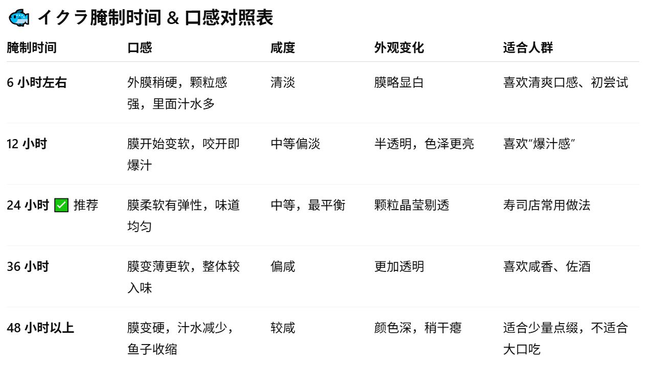 三文鱼子腌制24小时风味最佳,颗粒晶莹,膜也会变得更透明柔软,这是寿司店常用做法:口感上鱼子膜柔软有弹性,味道均匀;咸度中等,最平衡;外观颗粒晶莹剔透。