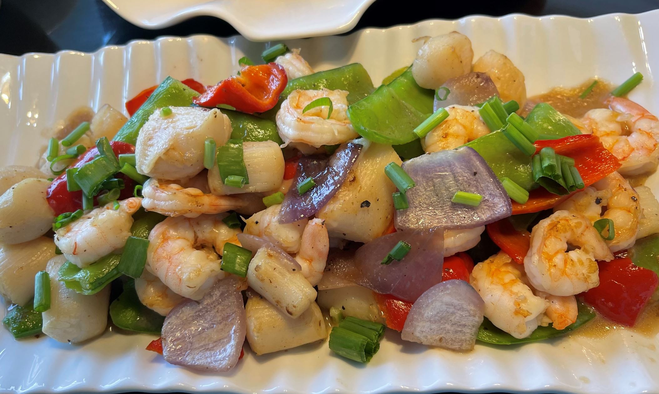 洋葱彩椒炒扇贝、虾