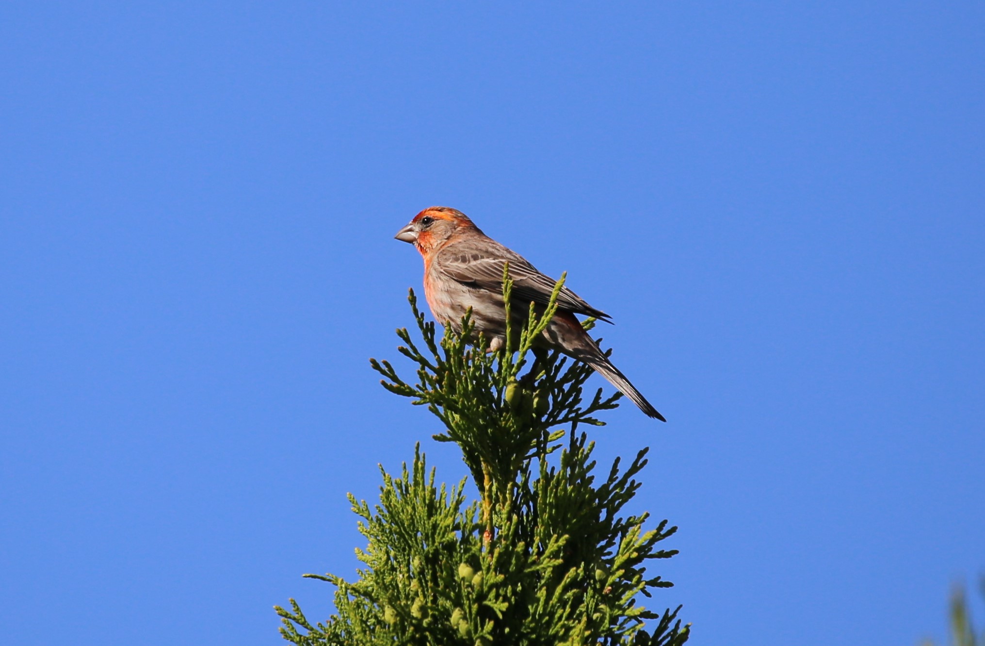 Finch)在这里的数量就像中国的麻雀一样,住家附近、草原荒地多见成群活动,家门口的柏树上也有小群家朱雀垒窝筑巢,每天早晨4、5点钟就在树上开叫、互相追逐。