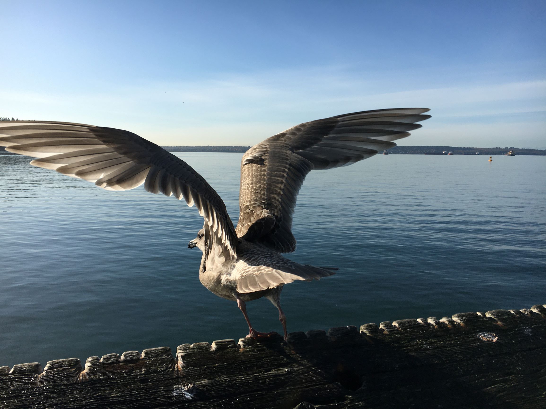 这只海鸥追逐着行驶着的BC渡轮。拍摄于温哥华岛驶往温哥华的渡轮上。
