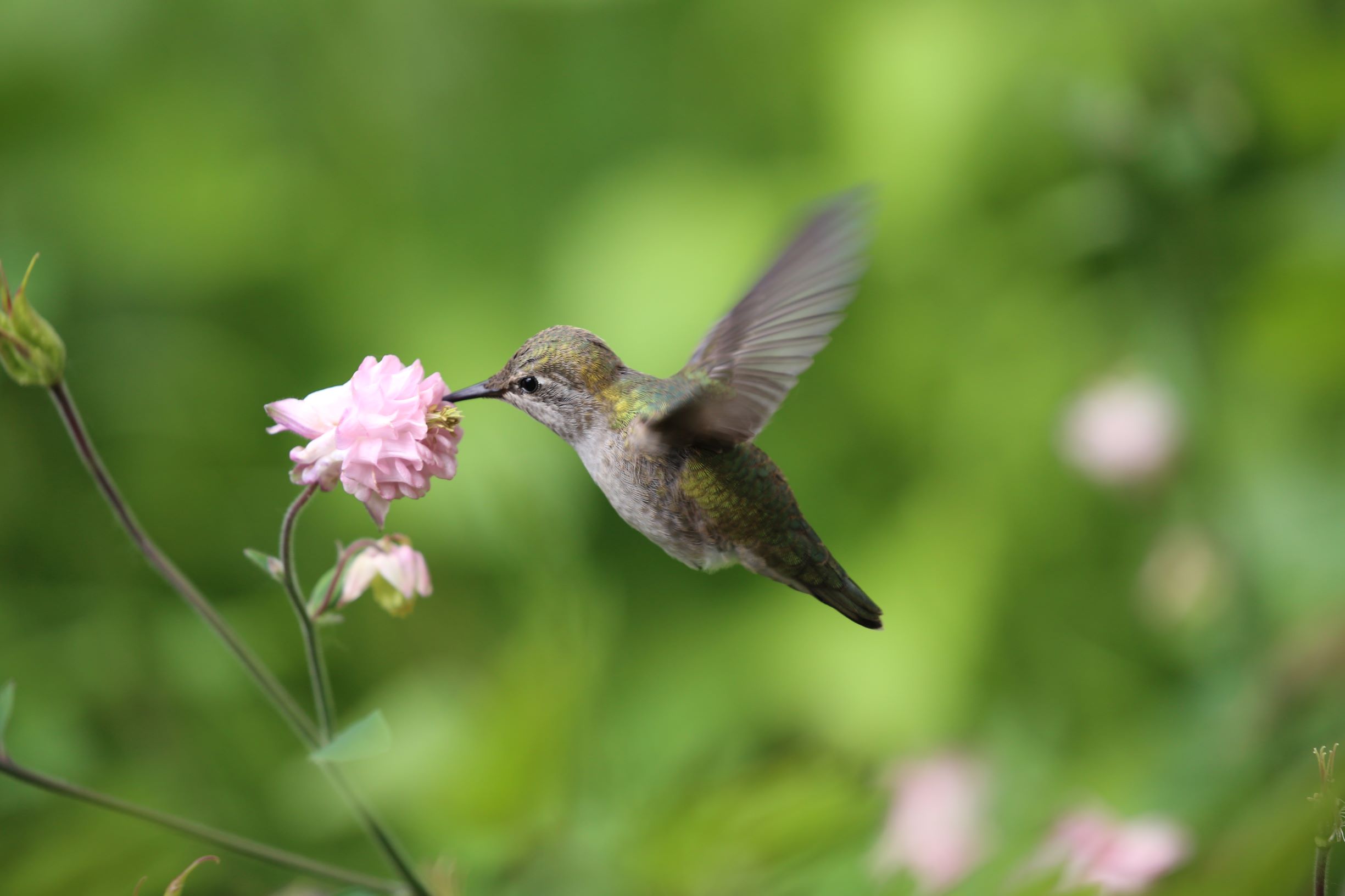 卡里奥佩蜂鸟(Calliope Hummingbird)正用其嘴细长并有伸缩自如的分叉舌头吸食耧斗菜(Columbine)花蜜。